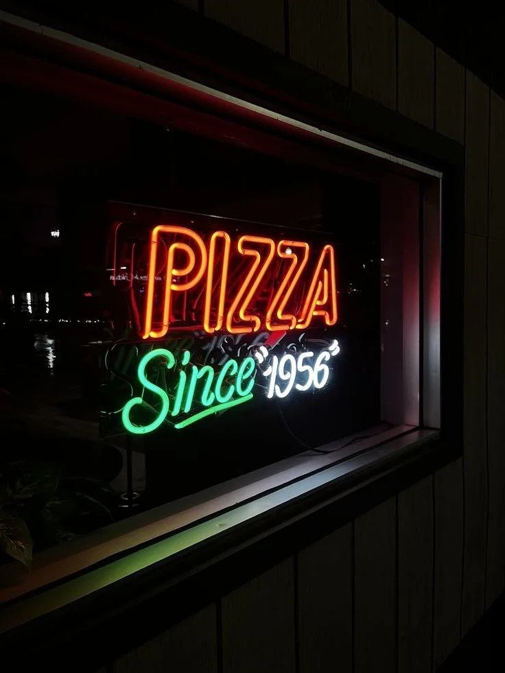 Standing still as if time had stopped in the 1980’s. Blurry neon red pizza sign and just a few tables here and there. It’s cash or check only, no plastic. The various cardboard cutouts tacked to the wall serve as your own personal size reference. Paper menus and a small window to the kitchen where orders are taken by an older gentleman that has spent his life making pizzas and running the business. His little shop has made it through the toughest of times and it’s the only real thing that the community can count on for a hot slice and affordable pricing. The art on the walls are masterpieces made by kids with crayons on the back of the paper menus. It’s a simple place that hasn’t changed since the day the doors opened. Next time you drive by what looks like a beat up old pizzeria, stop inside and experience the magic of going back in time underneath that glowing neon red pizza sign.